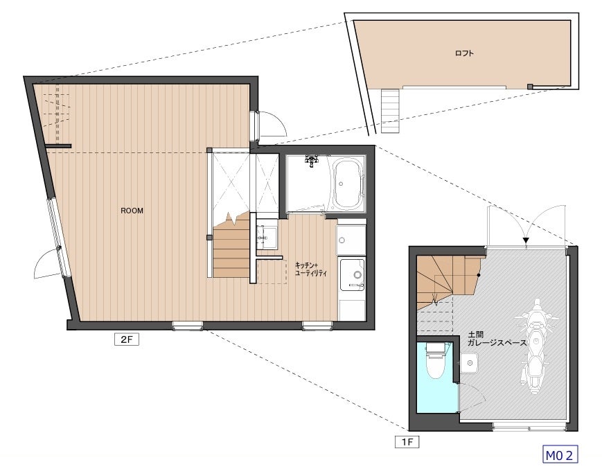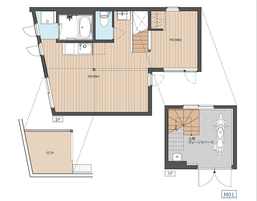 1F、2Fにまたがるメゾネットタイプの「M01」「M02」は1Fを大型バイク1台が余裕で置けるガレージスペースを中心にしたバイク専用といえる区画。