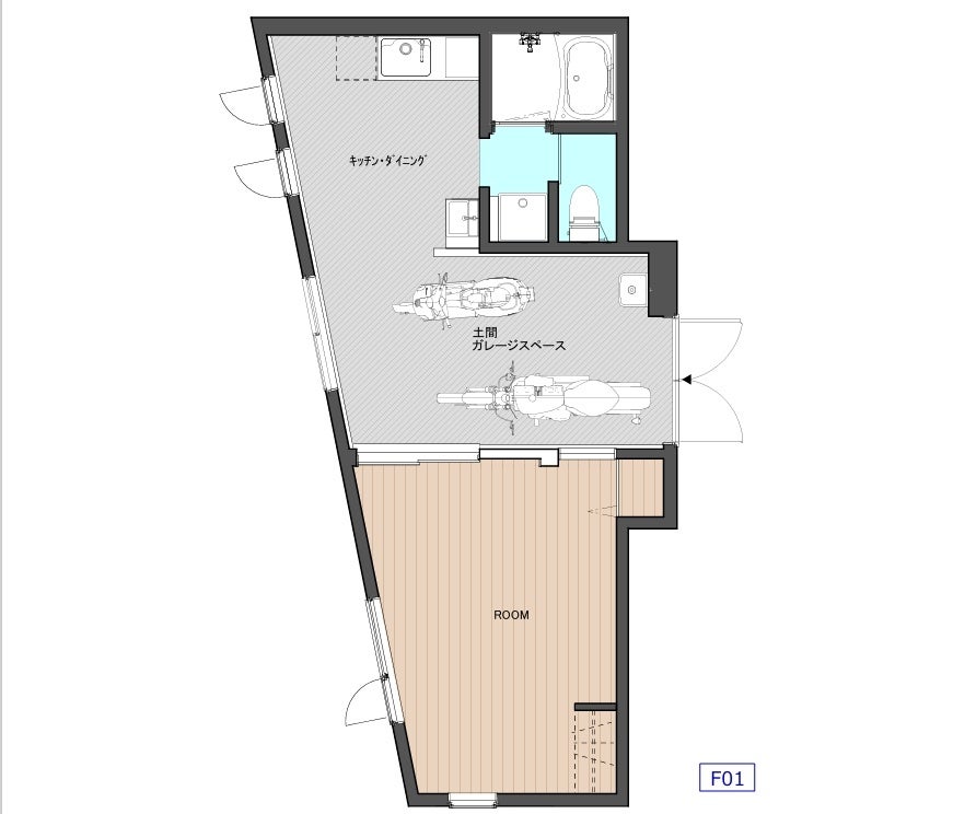 1Fの「F01」は大型バイクと中型バイクが1台ずつでも格納できる大きなガレージスペースを備えた部屋。