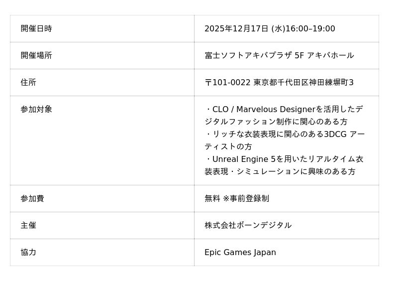 株式会社ボーンデジタル(本社:東京都千代田区、CEO:新 和也、URL:https://www.borndigital.co.jp/)は、2025年12月17日(水)に「デジタルツインが描く衣装表現 Marvelous Designer × Unreal Engineによる衣服シミュレーション」セミナーを富士ソフトアキバプラザにて開催します。
