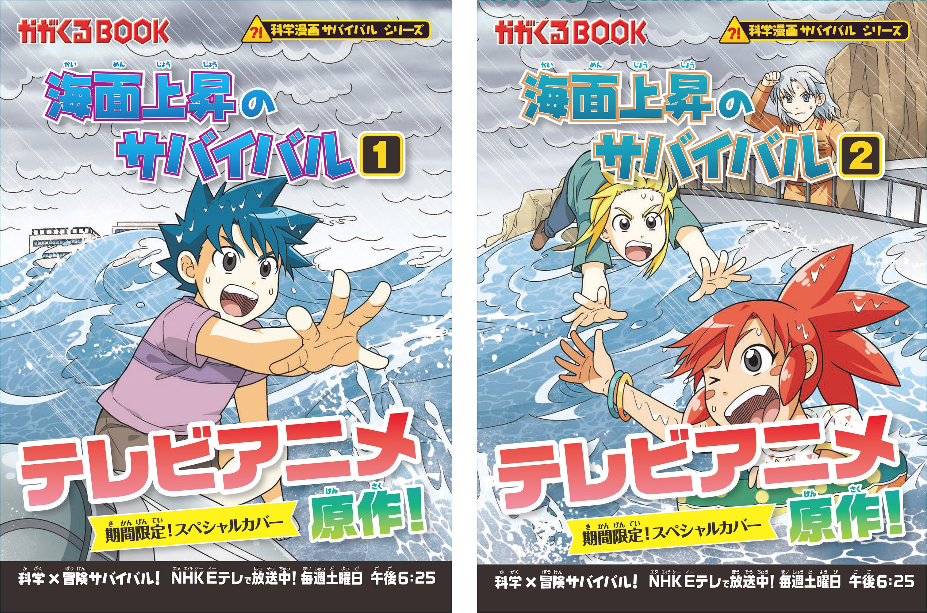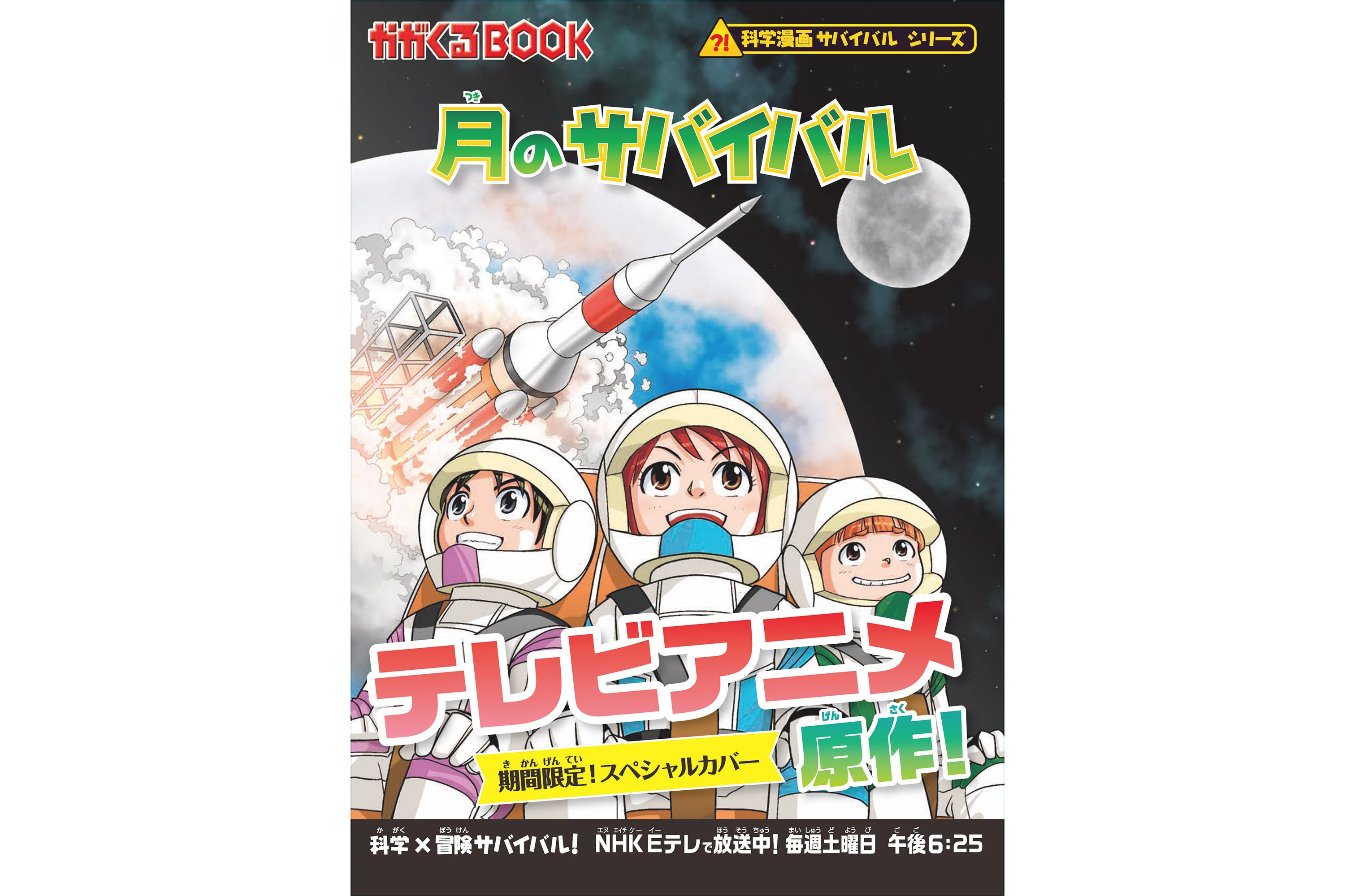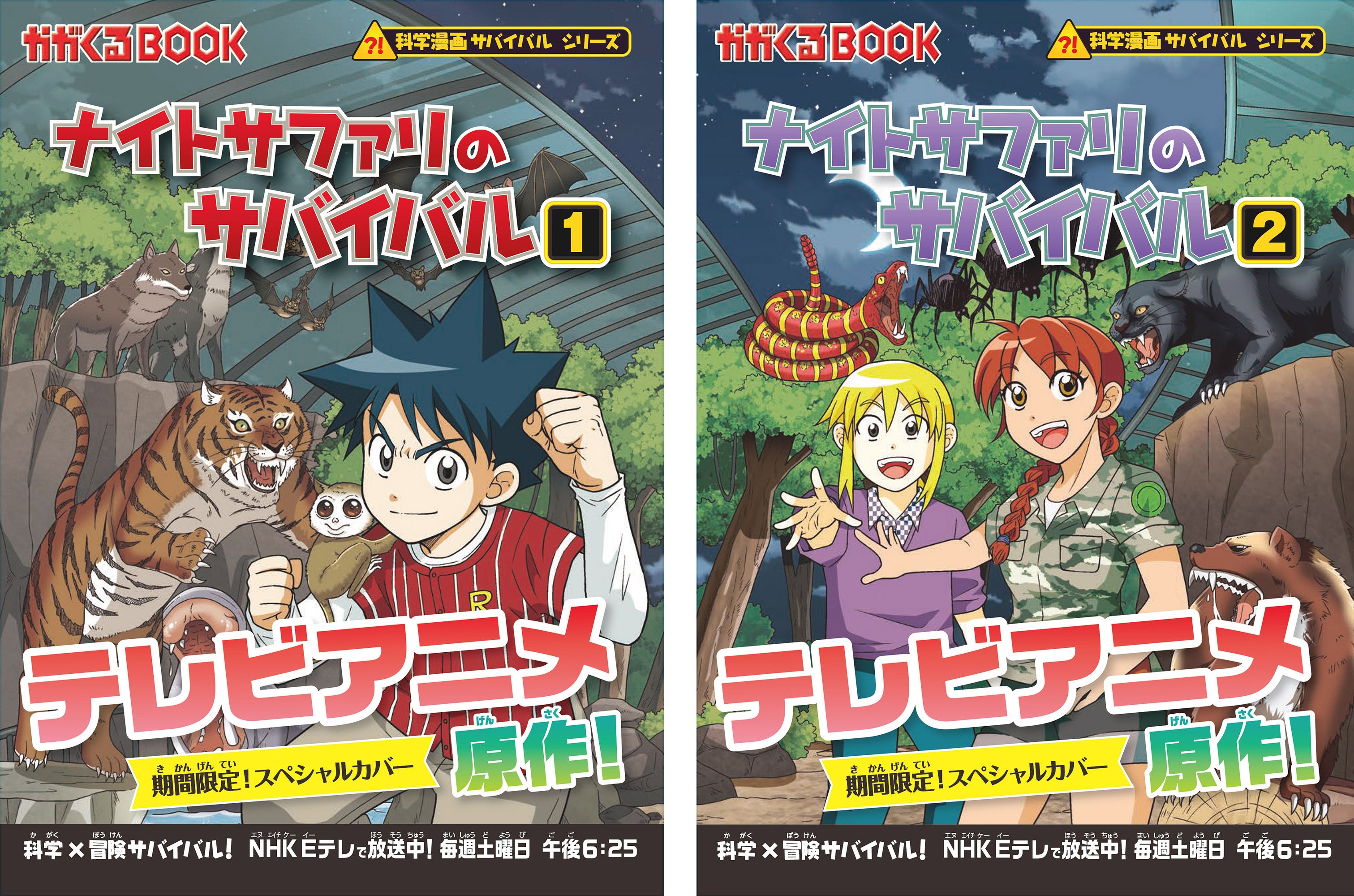NHK Eテレで放送中のテレビアニメ「科学×冒険サバイバル!」第2シリーズ。その原作となっている『ナイトサファリのサバイバル1・2』『月のサバイバル』『海面上昇のサバイバル1・2』が描き下ろしスペシャルカバーで登場します。『ナイトサファリのサバイバル1・2』のスペシャルカバーでは、ジオやケイに加え、メガネザルやトラ、ヘビ、カバなどの動物たちが勢ぞろい。『月のサバイバル』では、宇宙に飛び立つ直前のダイヤ・マーレ・キュリが希望に満ちた表情で描かれ、『海面上昇のサバイバル1・2』では、ジオ、ピピ、ケイが荒れ狂う海に立ち向かいます。