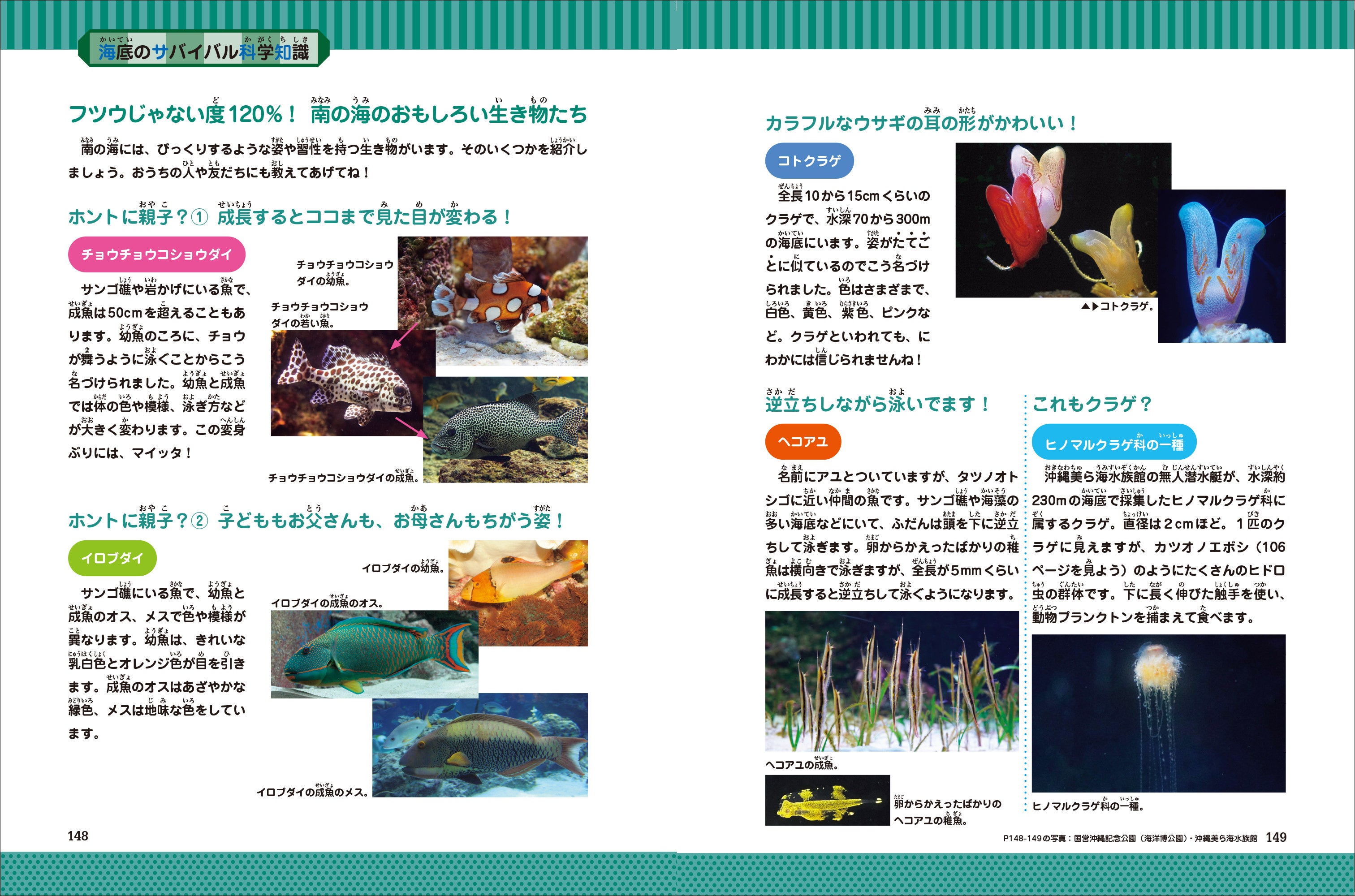 コラムでも、サンゴとサンゴ礁の違い、サンゴと人間のかかわり、海の生き物の命を支えるプランクトン、南の海の強い毒をもつ生き物、成長とともに姿を変えたりオスとメスで色が違ったりするおもしろい生き物などについて解説しています。