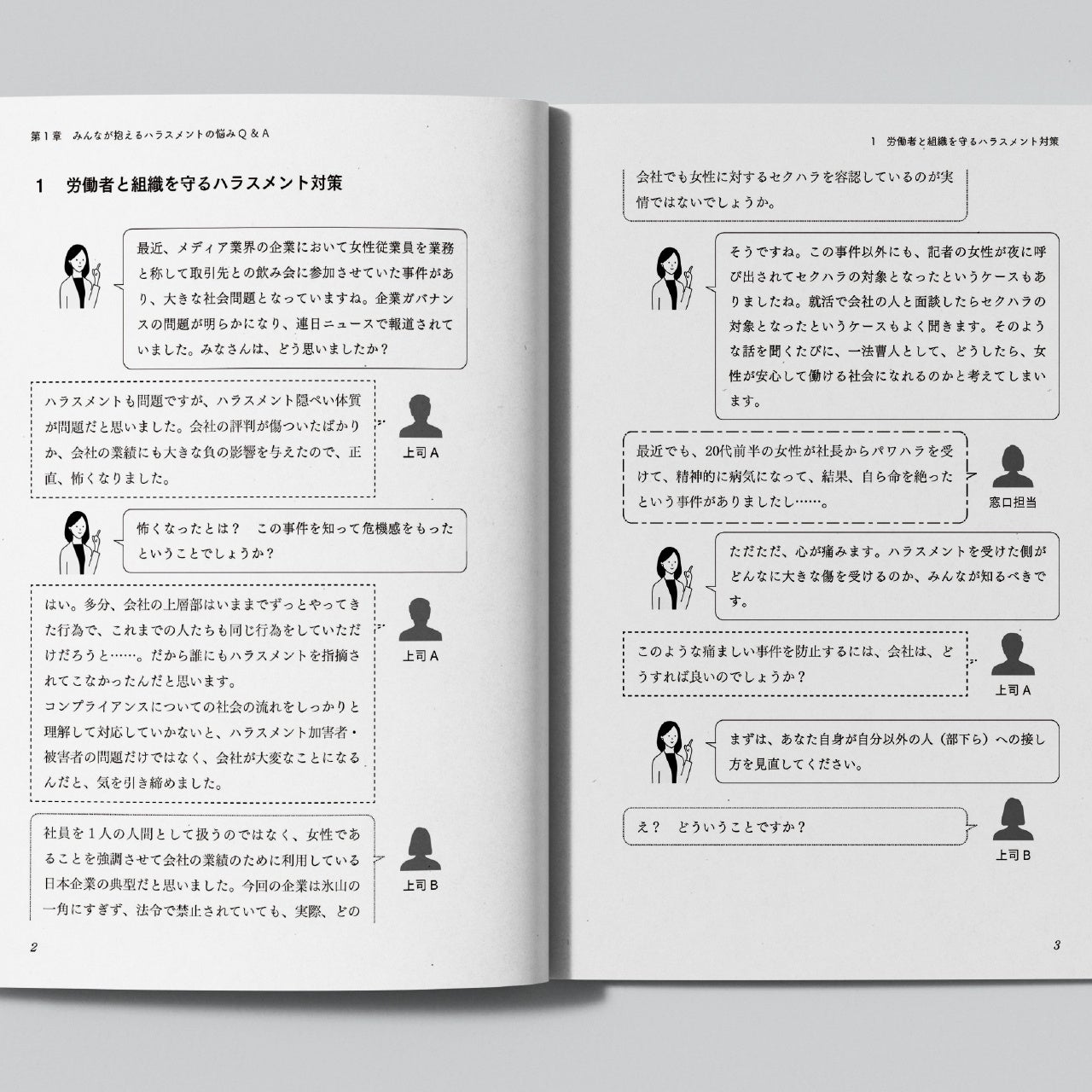 弁護士と社員との対話形式でハラスメントの概略をQ&A形式で解説しているため、ハラスメントの予備知識がない方にも、なぜハラスメントがいけないのかを理解できるようになっています。