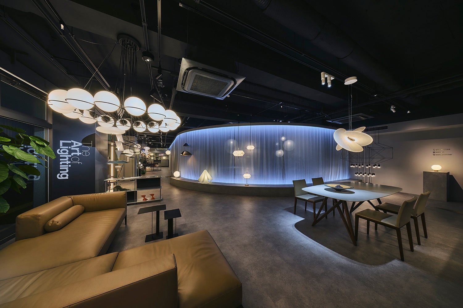 ショールーム全体を包むカーテンの間接光には、展示照明(電球色)を引き立てる補色として青を基調としたカラーライティングを採用。光を半分だけ透過する上質な素材のカーテンを2枚重ねることで、奥の展示照明の存在をほのかに感じさせながら、カラー光が美しくのる幻想的な効果を実現しています。