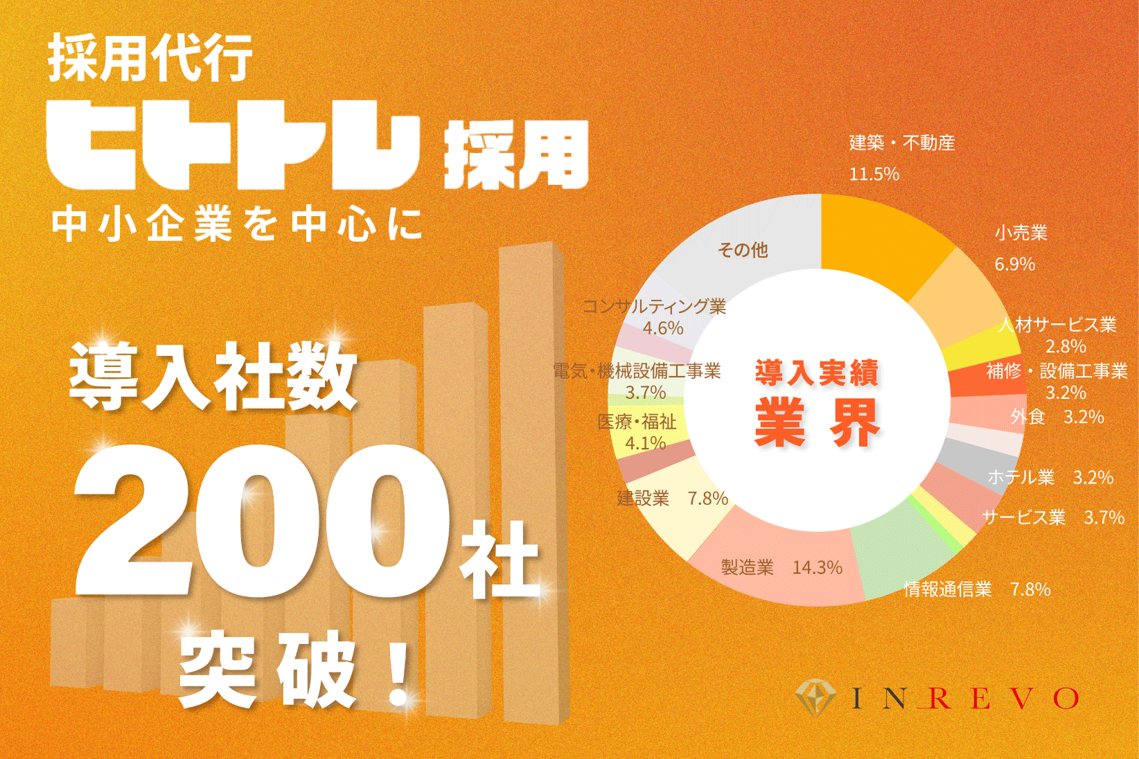 株式会社INREVO(本社:福岡県福岡市、代表取締役:南 晴仁)は、創業と同時に開始した採用代行「ヒトトレ採用」が、1年11か月で累計導入社数200社を突破したことをお知らせします。地方の中小企業を中心にご利用いただいており、導入企業の87%が非上場企業。社員数500名未満の企業が83.3%を占めています。