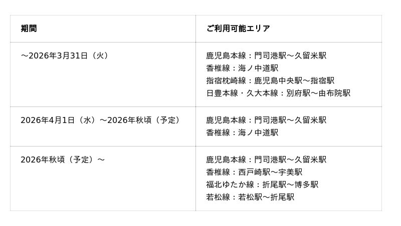 本格導入に際し対象エリアを変更いたします。鹿児島地区の指宿枕崎線および大分地区の日豊本線・久大本線での利用を終了し、新たに2026年秋頃(予定)から福岡地区の香椎線・福北ゆたか線・若松線を追加いたします。計92駅での利用が可能となります。