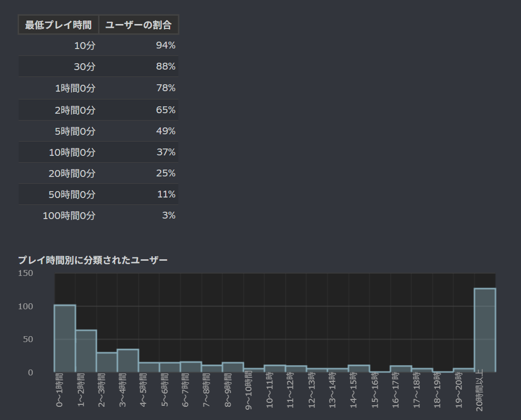 プレイ時間の内訳を見ても、20時間以上遊んだプレイヤーが約4割、さらに100時間以上遊んだプレイヤーも3%ほどいるなど、その熱中っぷりは本物です。