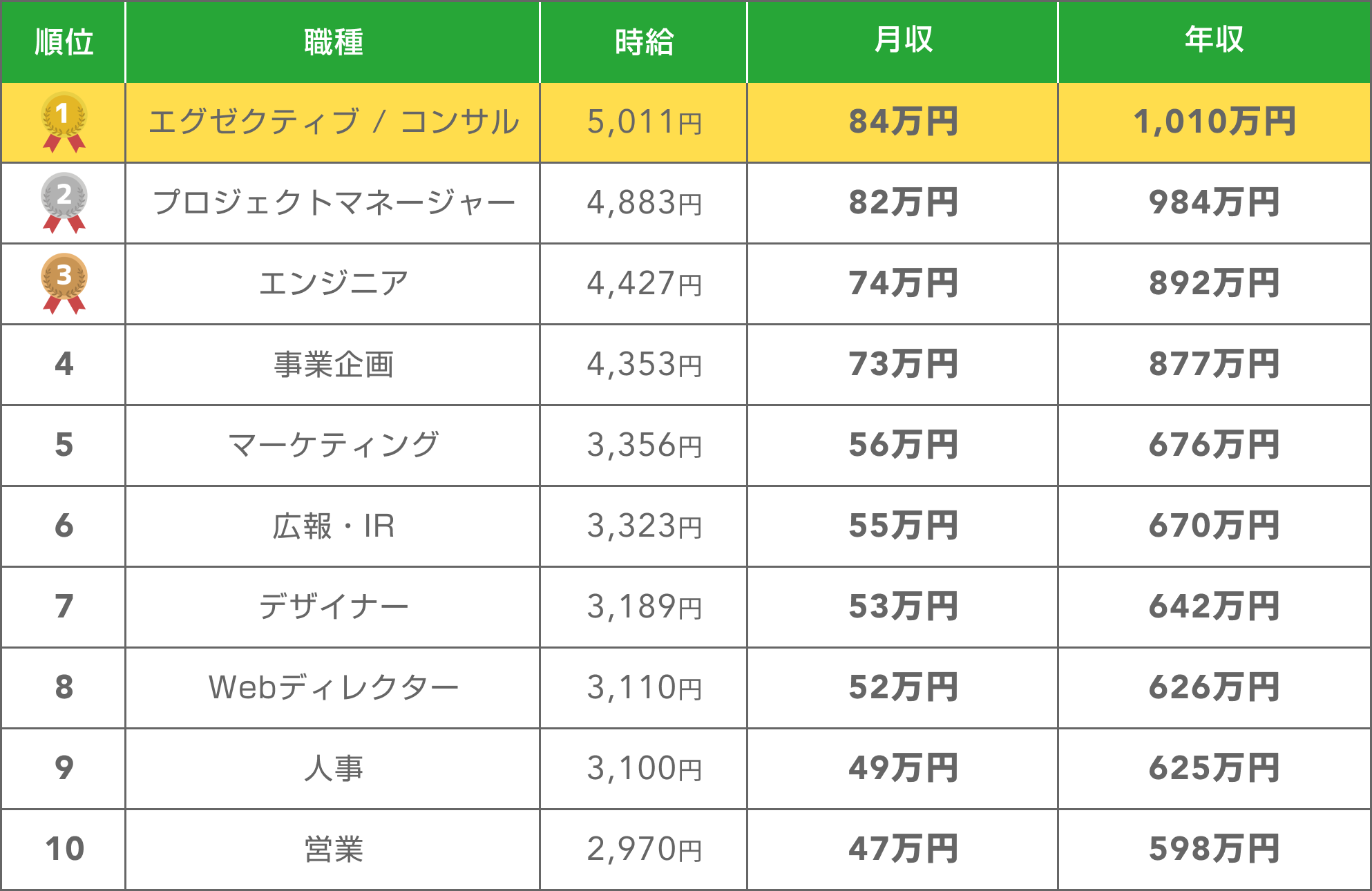 平均年収1,010万円(職種別年収ランキングトップ10中、1位)