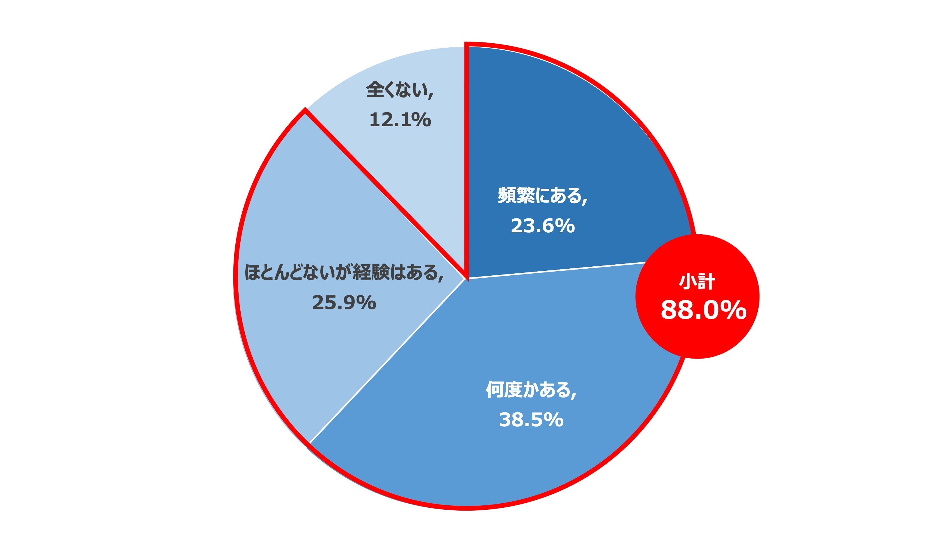 続いて、Q1で「全く把握していない」と回答した人を除き、発注先が「3社以上の下請け構造」になっていた経験について聞いたところ、「頻繁にある」が23.6%、「何度かある」が38.5%、「ほとんどないが経験がある」が25.9%と88.0%が経験ありと回答しました。