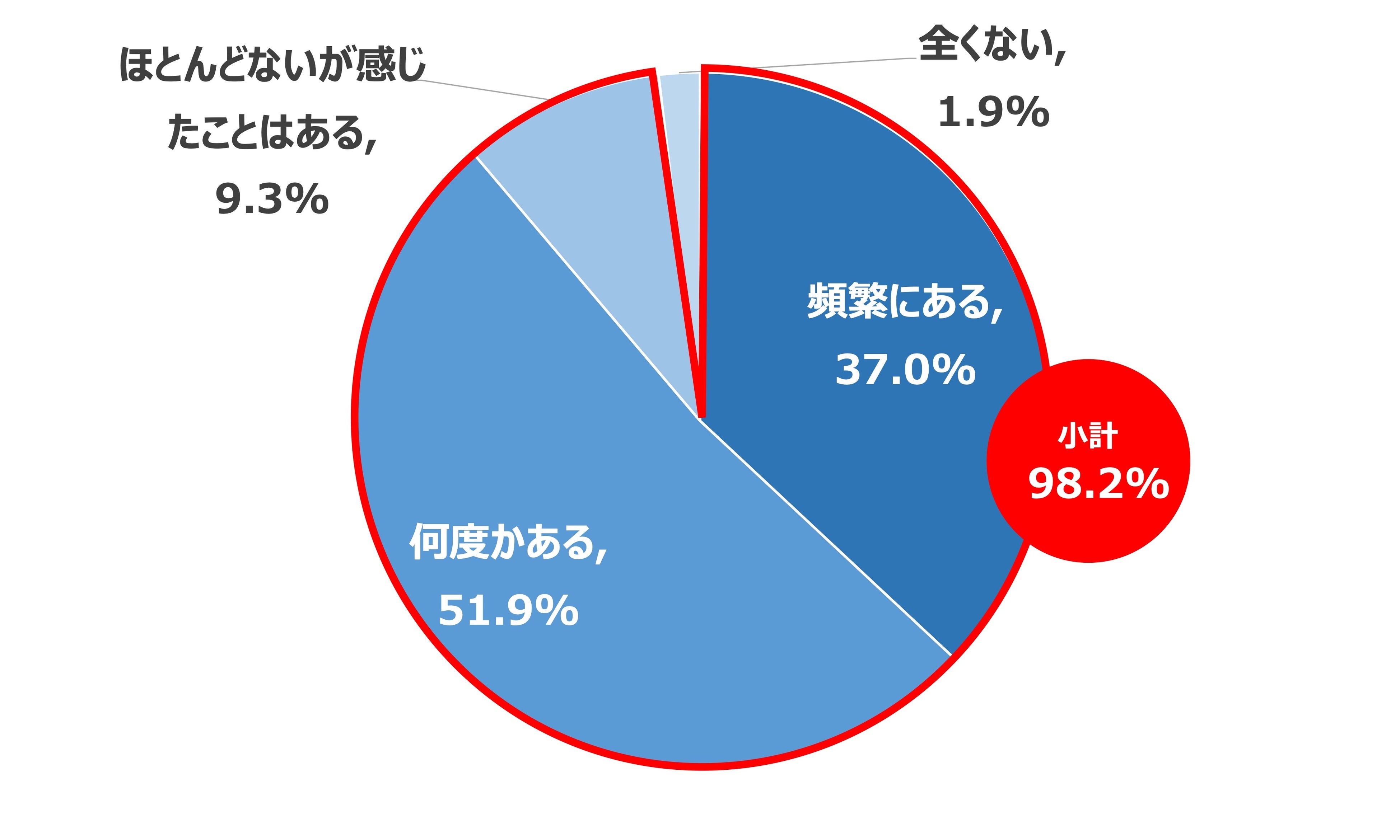 さらにQ3では、Q2で「頻繁にある」、「何度かある」と回答した人に過重下請け構造の案件で、過度なマージンを取られていると感じたことはあるか聞いたところ「頻繁にある」が37%、「何度かある」が51.9%、「ほとんどないが感じたことはある」が9.3%と98.2%が過度なマージンを取られていると感じると回答しました。
