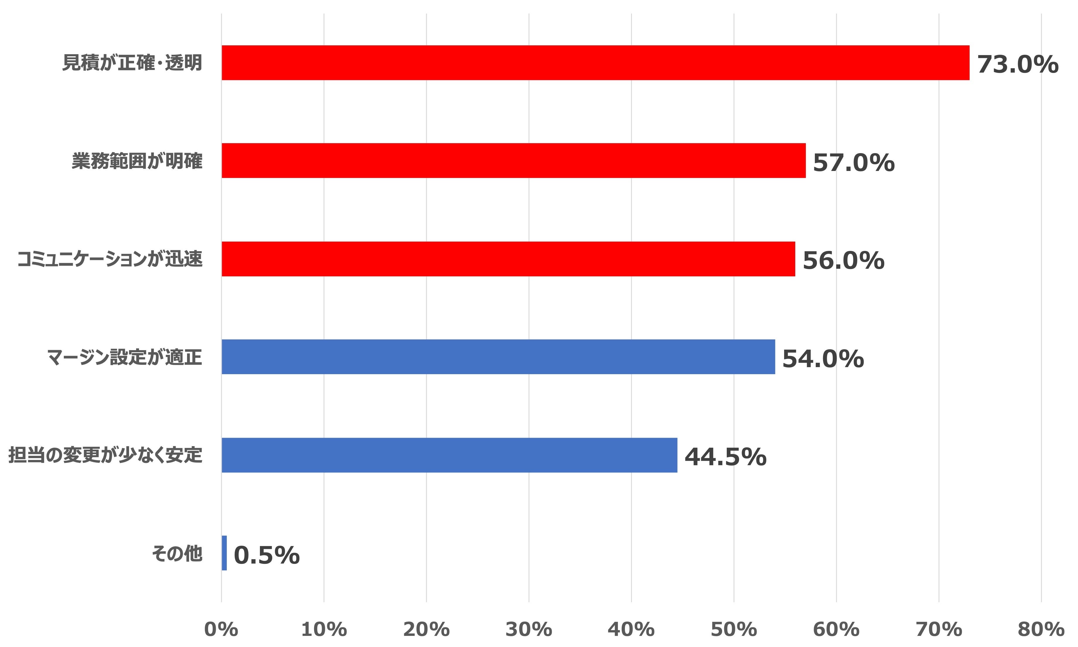 Q6で長い付き合いをしたい発注先の特徴を聞いたところ、 1位「見積が正確・透明(73%)」、2位「業務範囲が明確(57.0%)」、3位「コミュニケーションが迅速(56.0%)」と長期的な関係構築の要素として、見積の透明性が重要であることが明らかになりました。