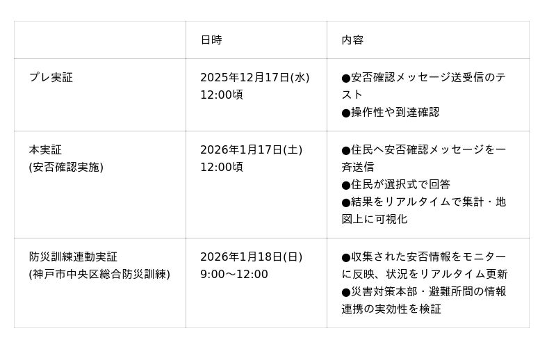 本実証実験は総合防災訓練の一環として実施するもので、住民参加型の安否確認の運用検証を行います。