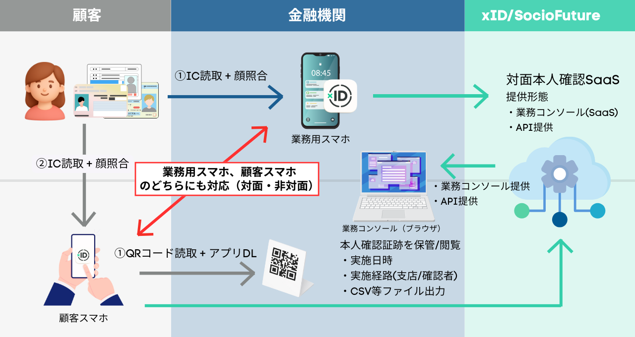 こうした業界の要請に対応するため、xIDはSocioFuture株式会社(本社:東京都港区、代表取締役 社長執行役員:菅原 彰彦、以下「SocioFuture」)と協業し、スマートフォンを活用したICチップ読み取りやデジタル認証技術を基盤とした次世代の本人確認環境の構築に取り組んでいます。
