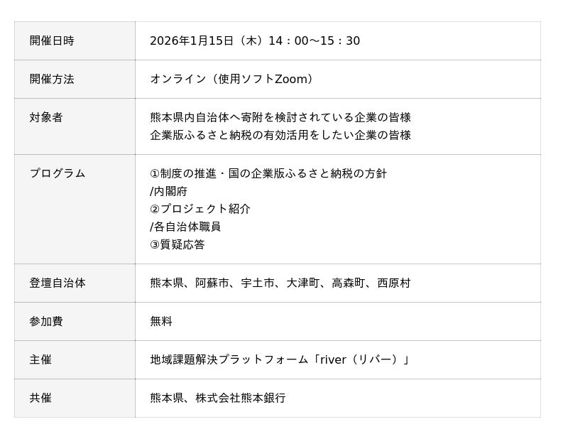 企業版ふるさと納税を活用した地域課題解決プラットフォーム「river(リバー)」を運営する株式会社カルティブ(本社:神奈川県横浜市、代表取締役:池田 清)は、熊本県および「river」パートナー企業である株式会社熊本銀行との共催で、2026年1月15日(木)に「熊本県企業版ふるさと納税寄附プロジェクトご紹介セミナー」を開催することをお知らせいたします。