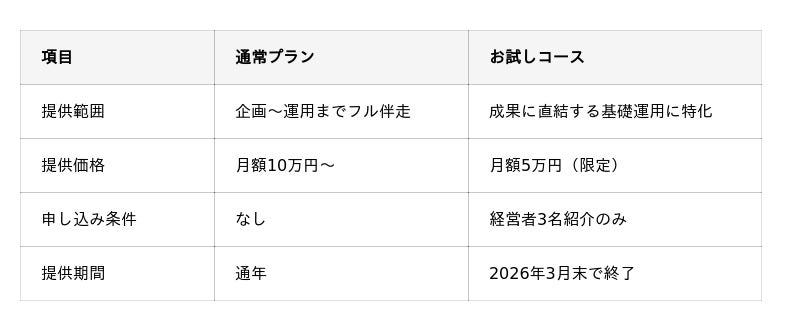 [表: https://prtimes.jp/data/corp/80381/table/88_1_8537b1ee09278c7ee4ff2eafad6ebfae.jpg?v=202512171245 ]結論:X(旧Twitter)運用の核だけ最短で盗める“抜け道”のようなプランです。