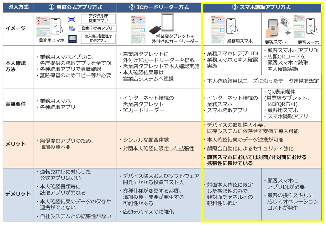 本人確認業務は、2027年4月に犯収法施行規則の改正が予定されており、非対面本人確認においては公的個人認証(JPKI)などICチップによる読み取りを行うことが義務化されます。また、対面本人確認においても、警察庁よりICチップの読み取りを義務づける方針が明らかにされたため、新たな対応が求められています※1。現在、対面本人確認ツールは、主に3方式で、1.官公庁が提供する無償公式アプリで実施する方式、2.ICカードリーダーを使用して実施する方式、3.民間事業者が提供するスマホ読み取りアプリで実施する方式があります。1.の無償公式アプリで実施する方式は追加投資が不要ですが、一方で、券種ごとにアプリをダウンロードする必要があり、またアプリでは真贋確認までの対応となることから、本人確認書類のコピーや確認記録書の対応が必要で、オペレーションの負荷には課題が残ります。2.のICカードリーダーを使用して実施する方式は、シンプルな操作でユーザビリティに優れているものの、ハードウェアの導入や管理にかかるコストが高く、かつ営業店や外出先での対応に制約があります。また、本人確認書類が刷新されるたびに対応が必要になるため、今後予定されているマイナンバーカードや在留カードの刷新にも対応が必要になります※2,3。