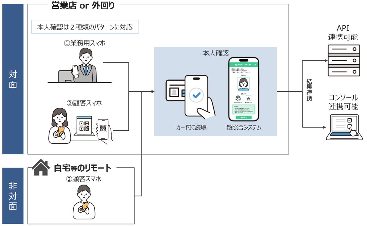 こうした背景から、当社はスマートフォンを活用した本人確認と顔照合技術を組み合わせ、非対面・対面の両チャネルにおいて法令改正の対応と本人確認業務のDX化を両立する、スマホ読み取りアプリ方式の本人確認プラットフォームの開発に着手しました。