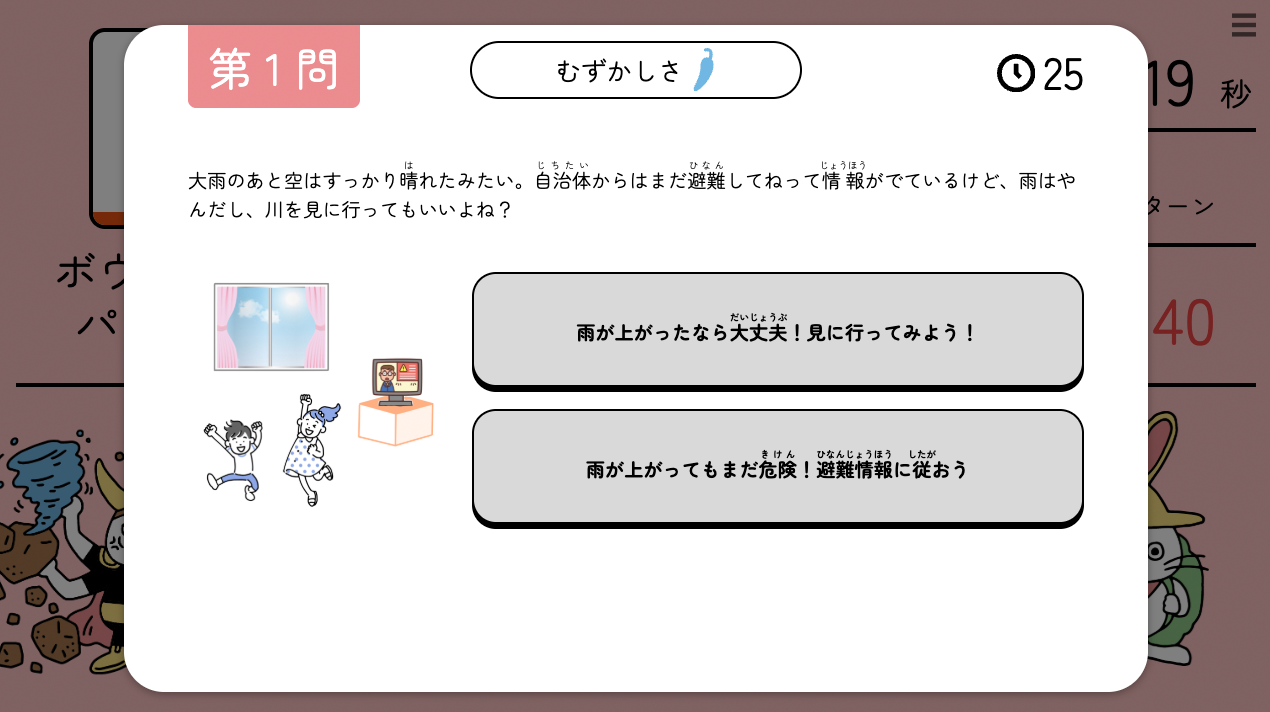 防災クイズに正解すると得点がアップ