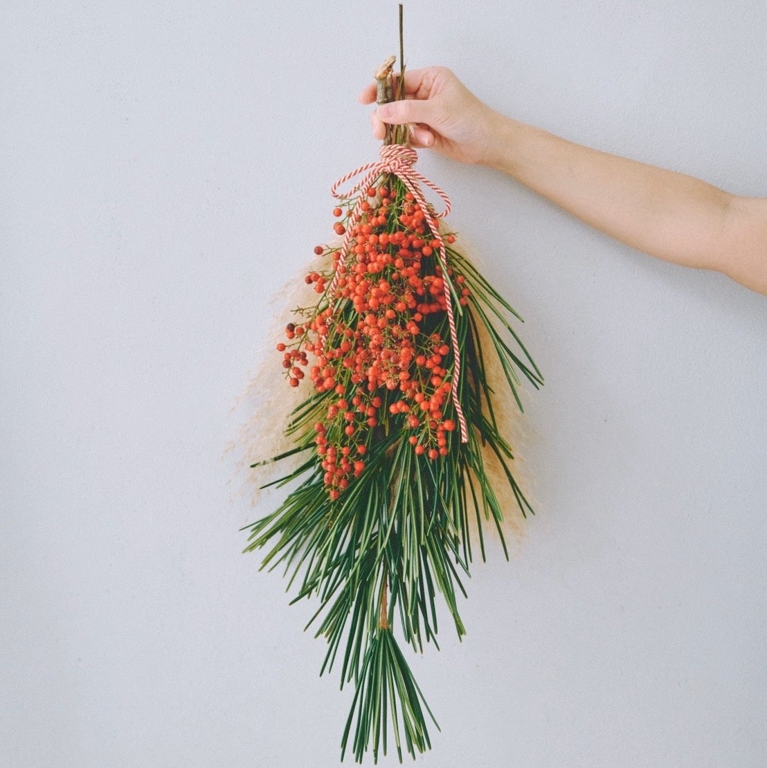 花屋であるNOKI 西村美奈代さんに教わりながら、高野槙・南天・柊など和歌山産の素材を用いたスワッグをつくります。1人1束の製作を予定。