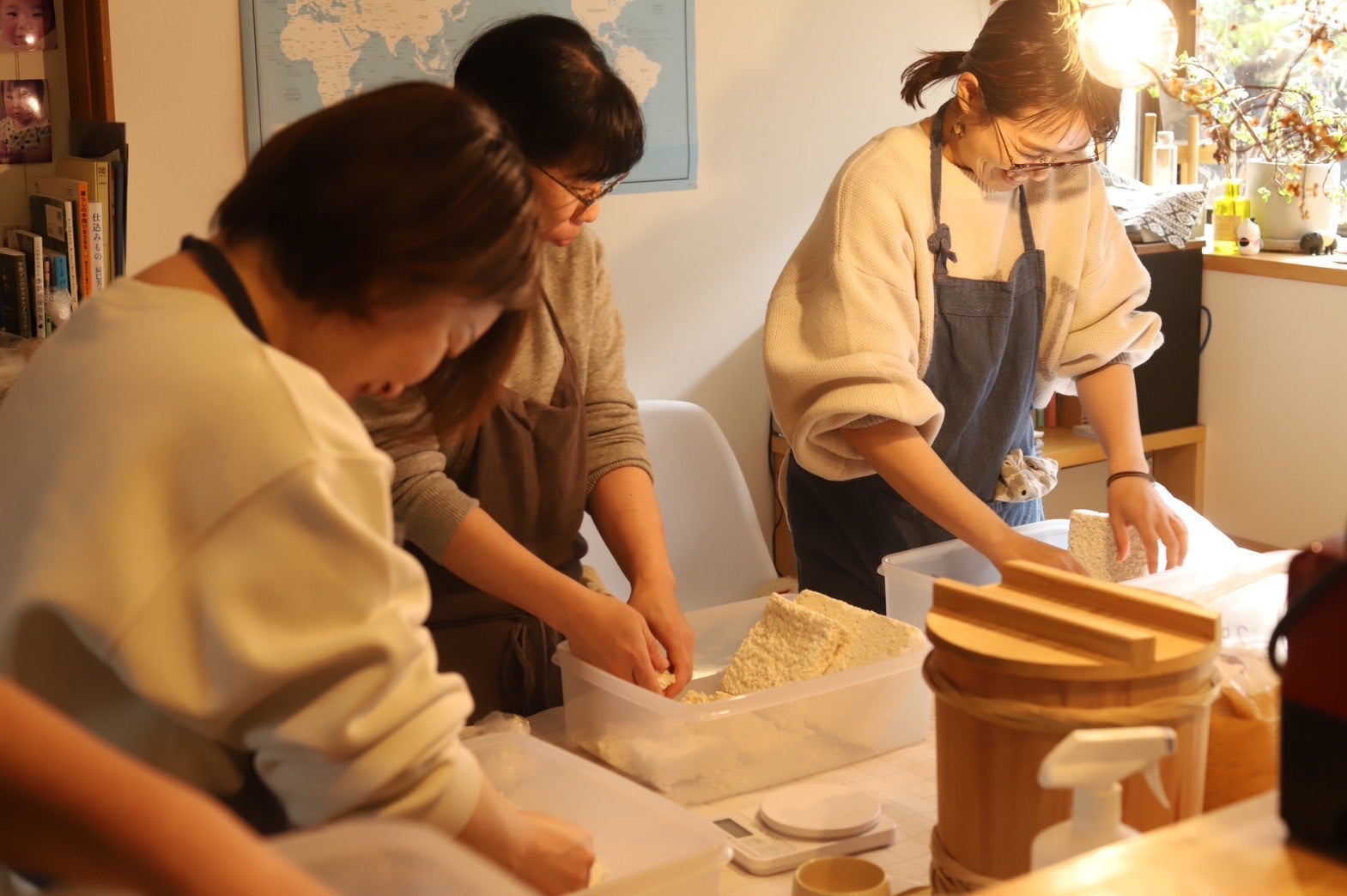 さかな農園 阪中純子さんが栽培した大豆を一部用いて、寒味噌づくりを教わります。1人約1kgの仕込みを予定。