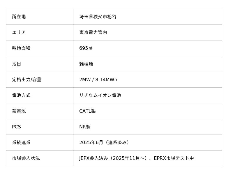 【案件1.】埼玉県秩父市2MW蓄電所(連系済み・稼働中)[表1: https://prtimes.jp/data/corp/116500/table/226_1_4662b35bc74eb57b2fa76ee2bbcb3ae0.jpg?v=202512160915 ]