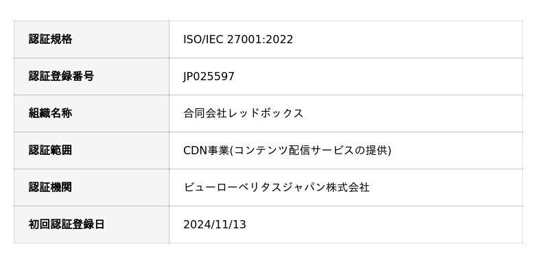 国内初*1の月額定額CDNサービス(エッジキャッシュ)を提供する合同会社レッドボックス(本社:東京都渋谷区、CEO:小川 勝久)は、情報セキュリティマネジメントシステム(ISMS)の国際規格である「ISO/IEC 27001:2022(JIS Q 27001:2023)」の認証を更新したことをお知らせいたします。