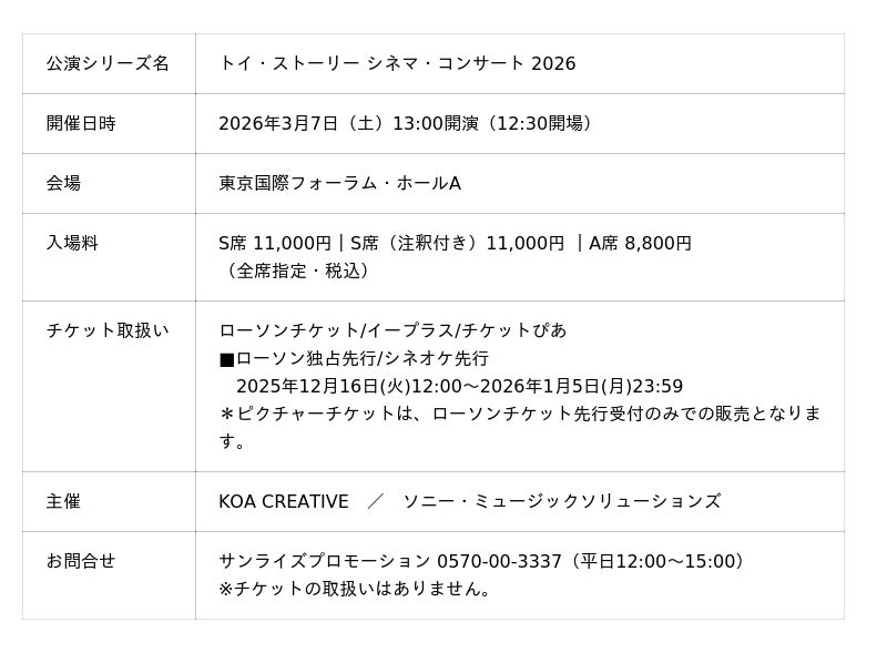 タイトル:トイ・ストーリー シネマ・コンサート 2026日時:2026年3月7日(土) / 開演:13:00(開場:12:30)