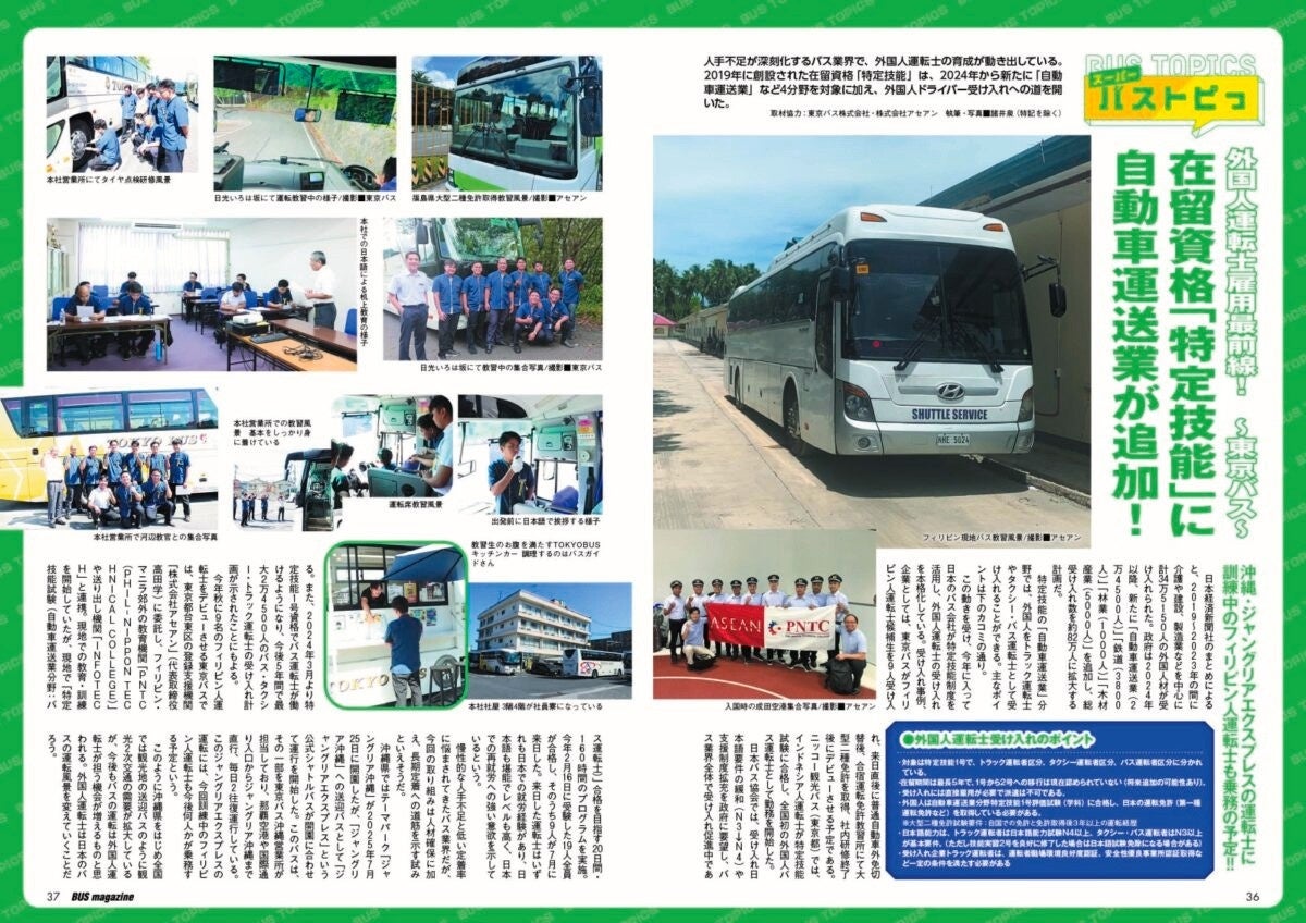 人手不足が深刻化するバス業界で外国人運転士の育成が動き出している。2019年に創設された在留資格「特定技能」は、2024年から新たに「自動車運送業」など4分野を対象に加え、外国人ドライバー受け入れへの道を開いた。そしてこのたび、フィリピンから運転士候補生9人を招き、研修が開始された。この期待すべき制度改革と即時起こされたアクションに、今後のバス業界の未来を見ていただきたい。