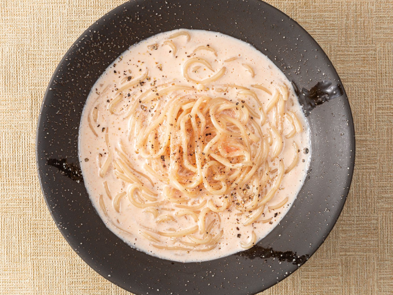 「4種のたらことお出汁のスパゲティ」は、丸ごと1本の生たらこに、香ばしい炙りたらこ、たらこと昆布の旨煮、さらに生パスタに絡ませたばらこと、たらこの異なる食感や味わいを思う存分楽しめる一皿です。お出汁をかければスープスパゲティとしてお楽しみいただけます。また、こっくりとした味わいが恋しい方には「たらこと生クリームの濃厚ソース」をご用意しました。生クリームを使用した特製ソースがもちもちの生パスタによく絡む、濃厚な一皿です。お好みで卓上の赤山椒をかければ、キリっとした風味が加わり、味の変化もお楽しみいただけます。