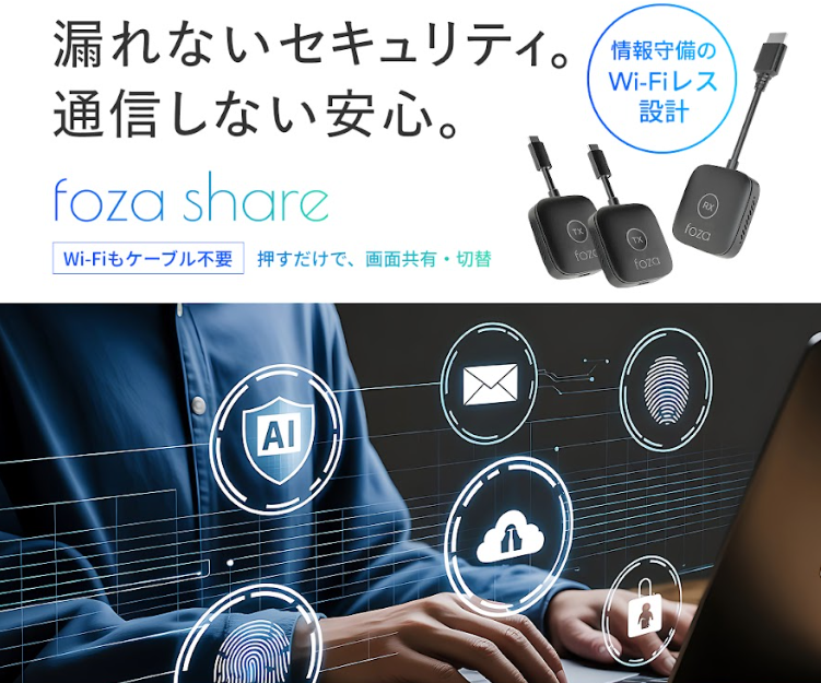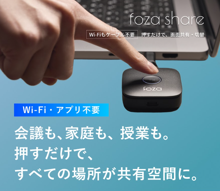 『foza share』は、複雑な設定やアプリのインストールを一切必要としない、次世代の画面共有スマートデバイスです。