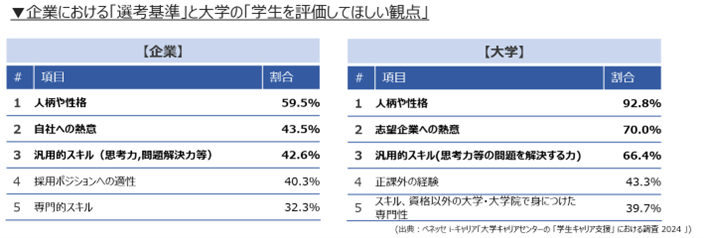 企業の「選考基準」と、大学の「学生を評価して欲しい項目」についても一致しており、以前から重視されている「人柄・性格(59.5%)」や「自社への熱意(43.5%)」に加え、「汎用的スキル(42.6%)」が上位に挙げられた。