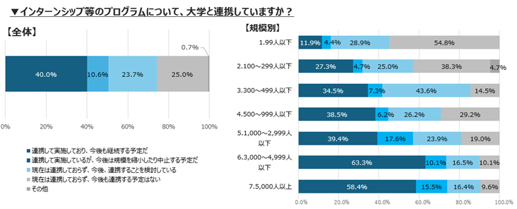 大学と既に連携し、今後も継続するという企業は40.0%、今後連携することを検討している企業も23.7%であり、大学と何らかの取り組みをしていこうとする意向を持つ企業は全体の6割を超えている。今後、さらに拡大していくことが予想される。