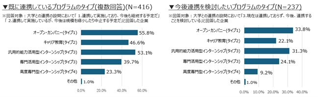 既に大学と連携している企業において実施されているプログラムでは、オープンカンパニー(タイプ1)と汎用的能力活用型インターンシップ(タイプ3)が50%を超えている。次いで、キャリア教育(タイプ2)も46.6%と多い。連携を検討している企業においても検討しているタイプは同様であることから、タイプ1と3が企業と大学で連携する際の主流になっていくと考えられる。