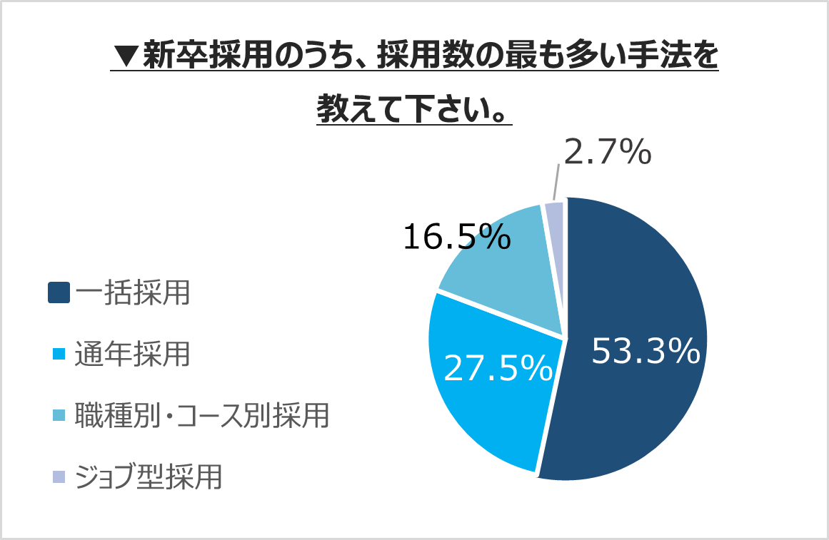 採用数の多い手法としては、「一括採用(53.3%)」が過半数半数を超えた。ただし、「通年採用(27.5%)」や「職種別・コース別採用(16.5%)」とする企業も多くなっている。