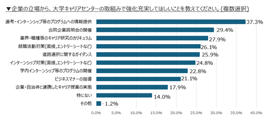 大学に対して、「企業の選考情報の提供(37.3%)」や「合同説明会の開催(29.4%)」といった、企業の採用に直結するような取り組みへの期待が高い一方、「業界・職種等のキャリア研究のカリキュラム(27.9%)」のような、学生の視野を広げる取り組みへの期待も高かった。