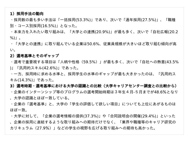 また、選考基準の選択率TOP3は、インターンシップ・本選考のいずれでも「人柄や性格」「自社への熱意」「汎用的スキル(思考力・問題解決能力等)」となっていました。前者の2つは以前から重視されていましたが、「汎用的スキル(思考力・問題解決能力等)」については、企業が「大学で学生が学んできた成果」として、評価基準の中での重視度を高めていると考えられます。一方、企業の採用水準と、実際に採用した学生の水準を比較して、そのギャップが最も大きいもの(改善したいもの)も「汎用的スキル(思考力・問題解決能力等)」でした。企業に求められるのは、選考基準として求める汎用的スキル等の言語化と、そこで求める水準を大学・学生に具体的に伝えることのようです。大学に対しても、学生の汎用的スキル等の育成を強化し、その成果を可視化することが求められていると考えられます。それらの実現のためには、産学でのデータやエビデンス、エピソードなどに基づいた具体性のある議論が必要ではないでしょうか。