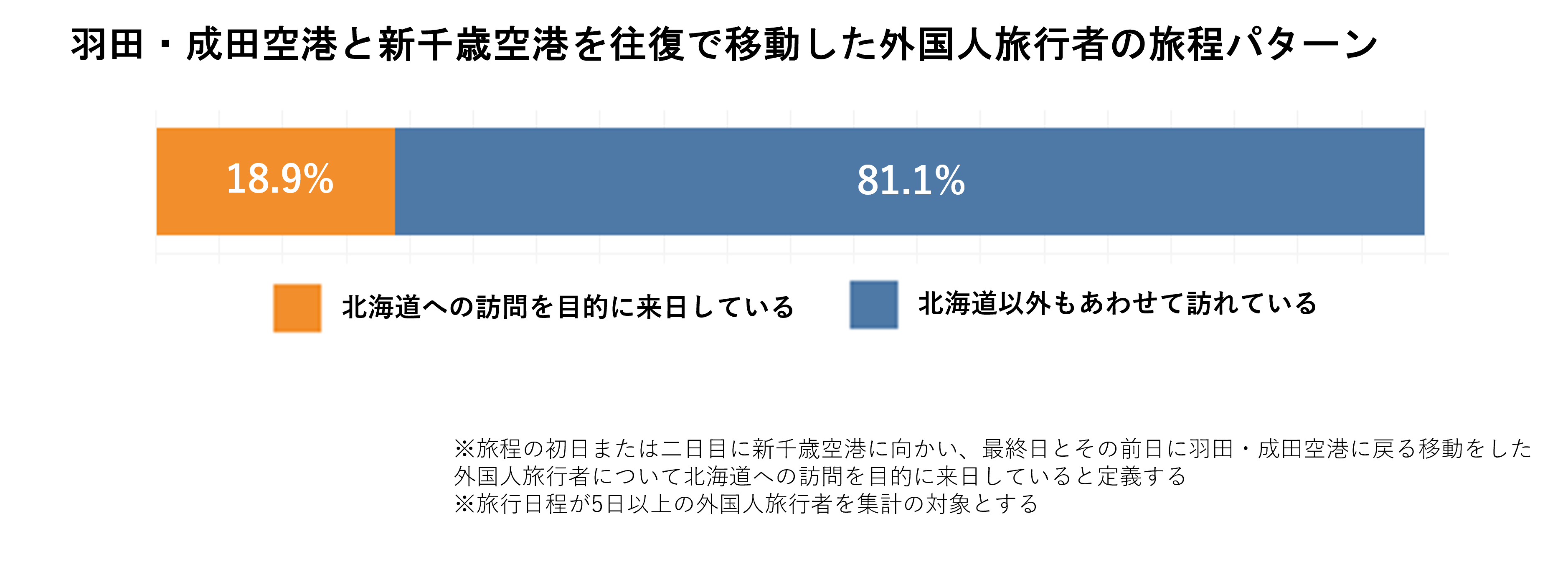 その結果、18.9%が、旅程の初日または二日目に羽田・成田空港から新千歳空港へ移動し、最終日またはその前日に再び新千歳空港から羽田・成田空港へ戻る旅程で移動していることが分かりました。この層は、東京を経由して、北海道での滞在を目的に来日していると考えられます。