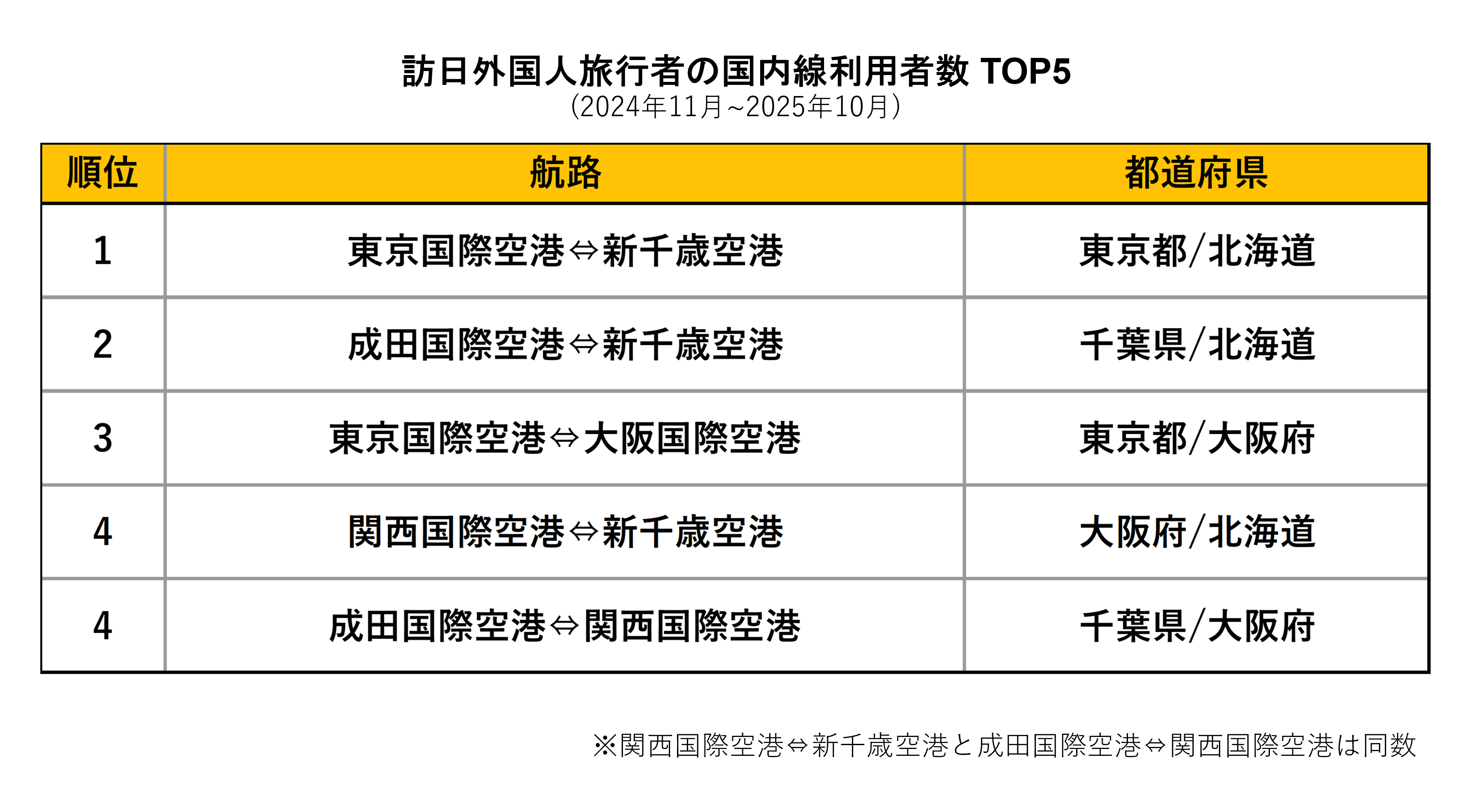 2024年11月から2025年10月までの期間で、訪日外国人旅行者の利用が多かった国内線のランキングを集計しました。結果、東京国際空港(以下、羽田空港)・成田国際空港(以下、成田空港)と新千歳空港を結ぶ航路、羽田空港と大阪国際空港を結ぶ航路など、北海道と東京都、東京都と大阪府、大阪府と北海道を結ぶ路線がTOP5を占める結果となりました。