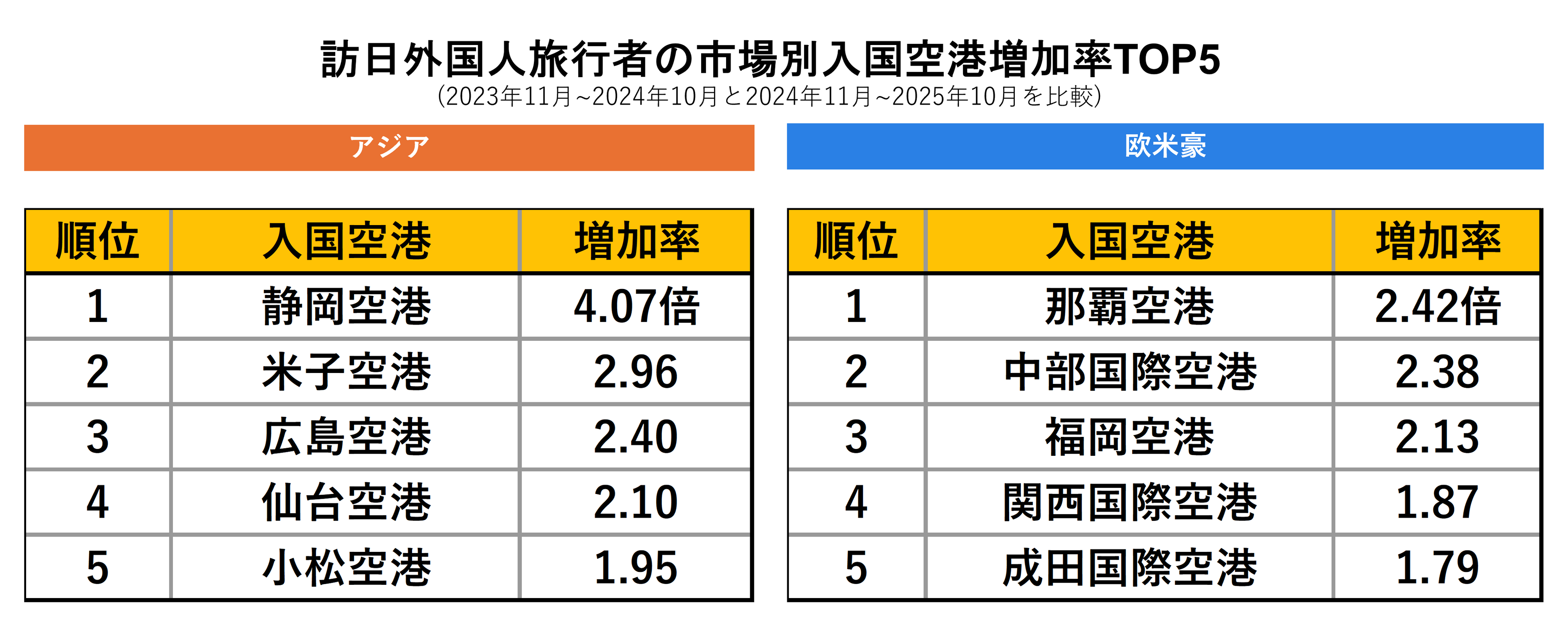 2024年11月から2025年10月までの実績を、前年同月期(2023年11月から2024年10月)と比較し、入国者数が増加した空港を市場別に分析しました。