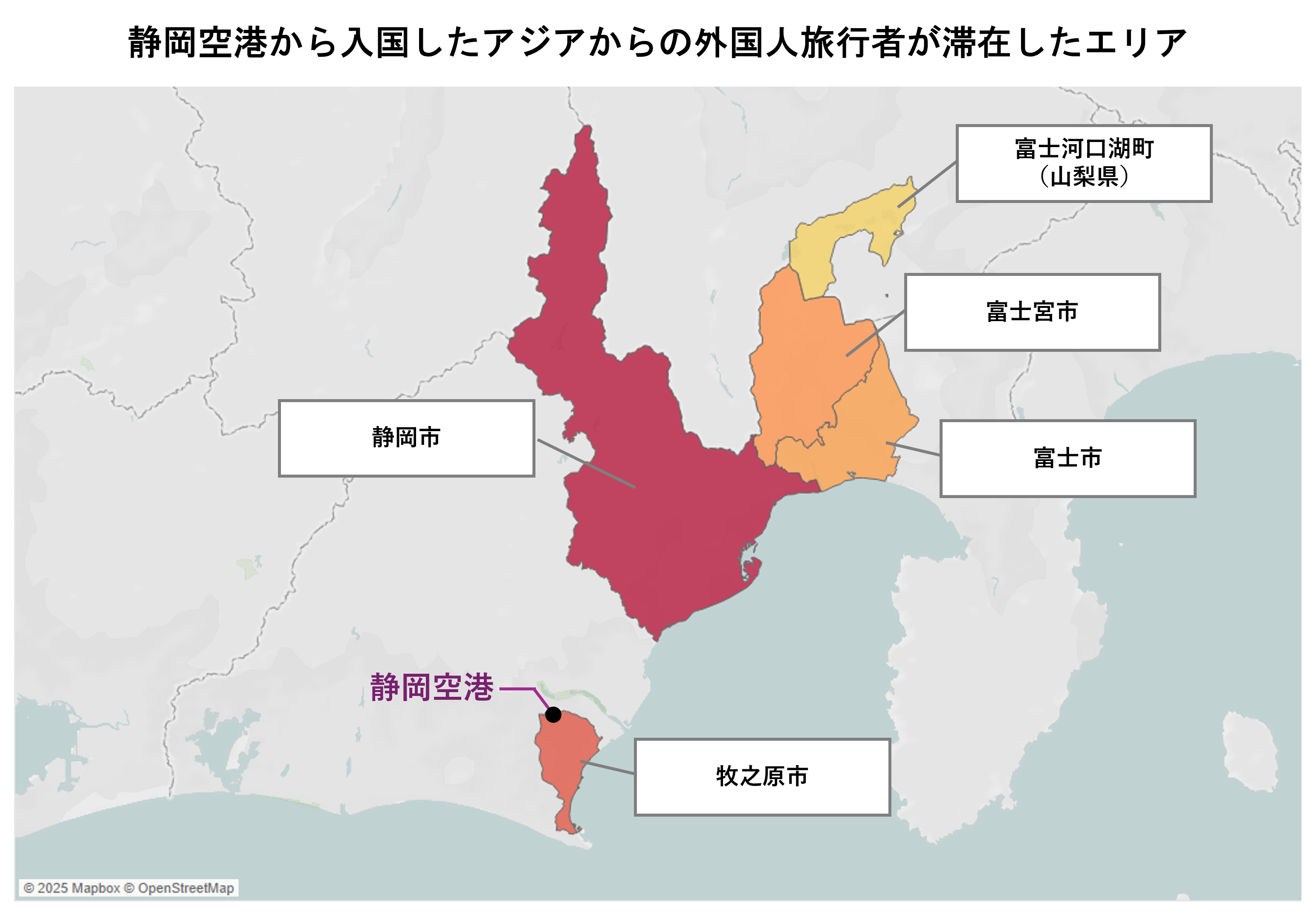 静岡空港から入国した旅行者が入国後に滞在した市区町村について確認したところ、空港のある牧之原市のほか、静岡市、富士宮市、富士市など静岡県内の市町村や、山梨県の富士河口湖町での滞在が見られました。