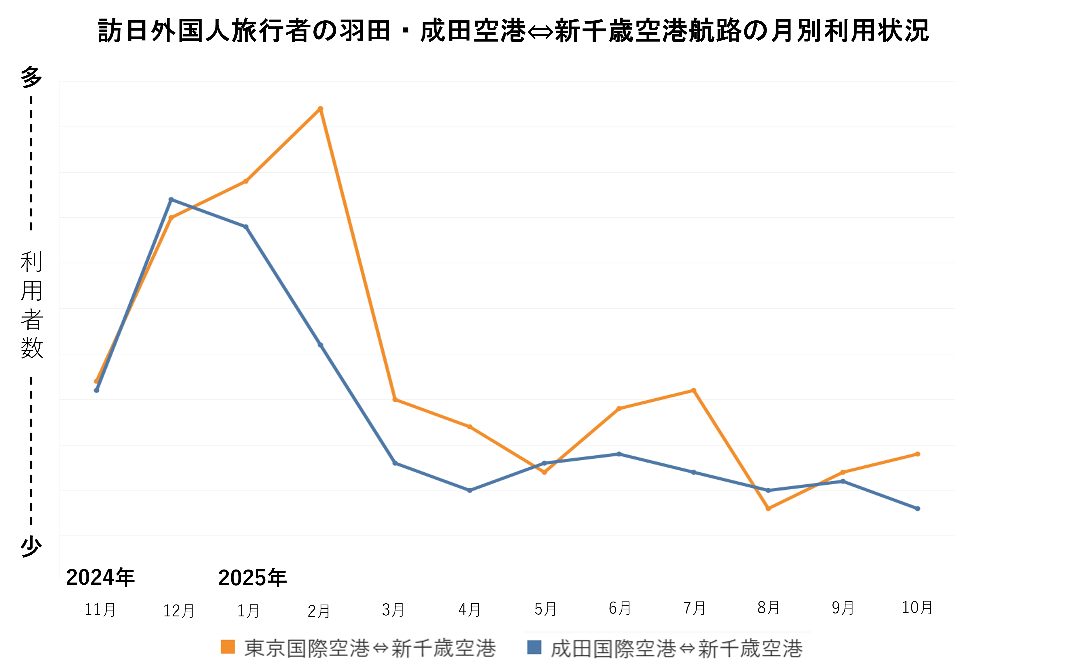 羽田・成田空港発着の新千歳空港航路の月別の利用状況を見てみると、羽田空港発着は2025年2月に、成田空港発着は2024年12月に最も利用者が増加しており、ともに冬期の利用者が多いことがわかります。