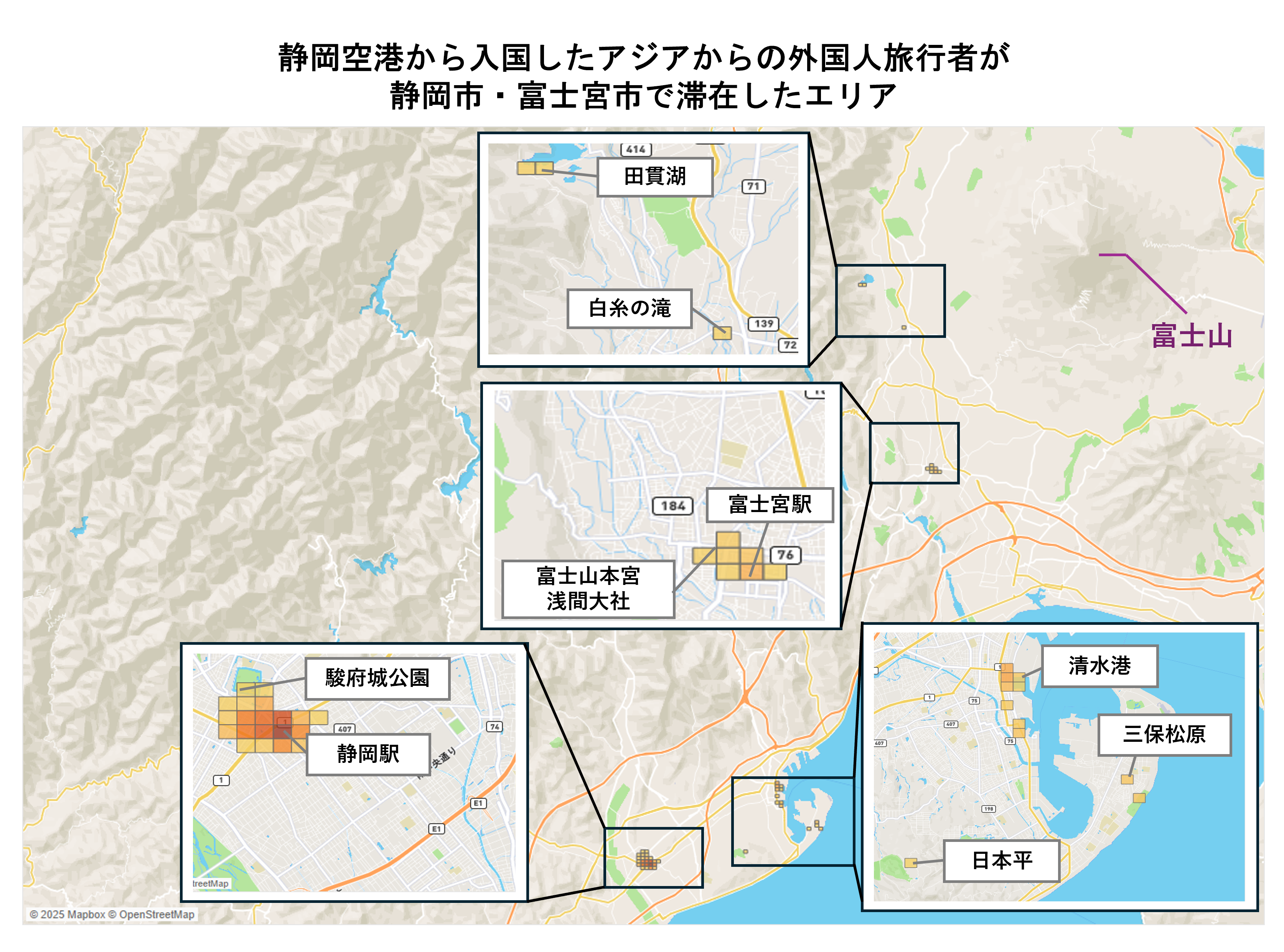 静岡市、富士宮市でのそれぞれの滞在箇所を確認すると、富士山世界文化遺産の構成資産に登録されている三保松原、富士山本宮浅間大社、白糸の滝や富士山の眺望を楽しめる田貫湖、日本平など、富士山に関連するスポットへ訪れていることがわかります。