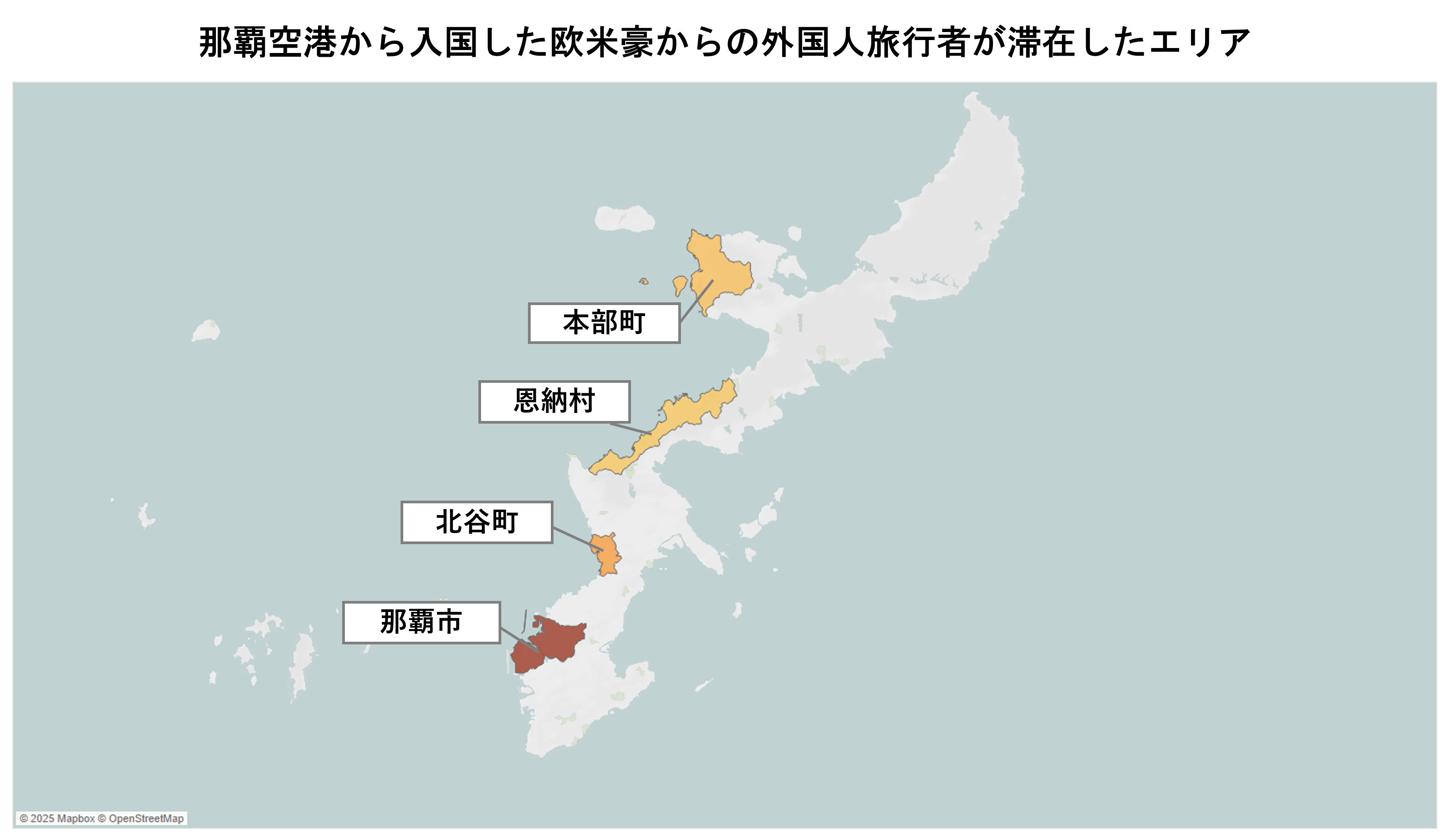 欧米豪からの旅行者が滞在したエリアのうち、沖縄県内の滞在人数の多かったエリアを確認したところ、那覇市や北谷町、本部町などに滞在が見られました。