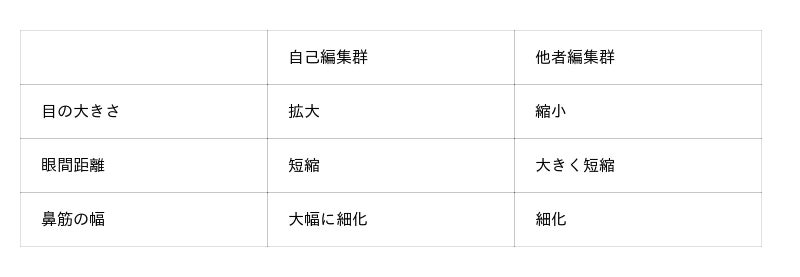 自己編集群と他者編集群で、目の大きさ、眼間距離、鼻筋の幅に有意差が確認されました。自己編集群は、目を大きく鼻筋を細くすることで、爽やかさや親しみやすさを強調したのに対し、他者編集群は、眼間を強く詰めて彫りと威厳を際立たせ、力強さや男らしさを強調しました。