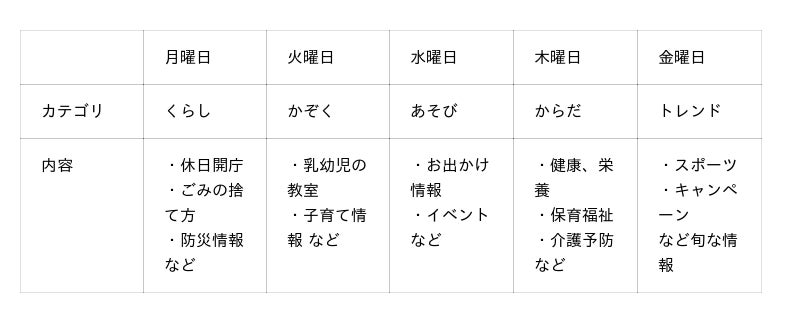 ・曜日ごとに5つのカテゴリで、色を分けて毎日1つ投稿します。各曜日の投稿内容は以下のとおりです。