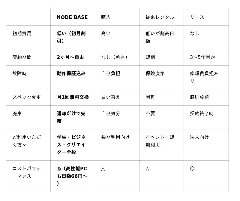 [画像2: https://prcdn.freetls.fastly.net/release_image/127939/2/127939-2-5aa3fc6ca2417fe1e3a61bdd113935fc-1981x1274.png?width=536&quality=85%2C75&format=jpeg&auto=webp&fit=bounds&bg-color=fff ]NODE BASEでは、利用目的に応じて選べる 4つの料金プラン を提供しています。全てのプランを安心してご利用できるように、共通したサポートをつけております。従来の長期レンタルやリースとは異なり、最低2ヶ月から必要な期間だけ契約でき、用途が変われば月単位でPCを入れ替えられる柔軟性が NODE BASE 最大の特徴です。