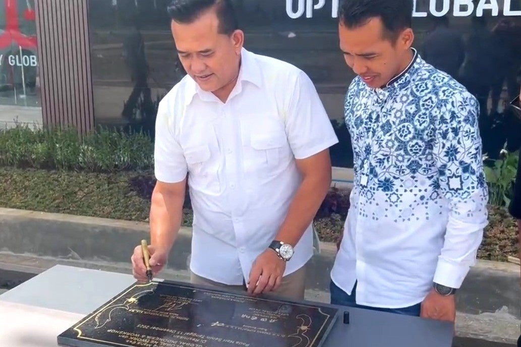 トレーニングセンターの定礎板に署名をするBP2MI西ジャワ統括代表
