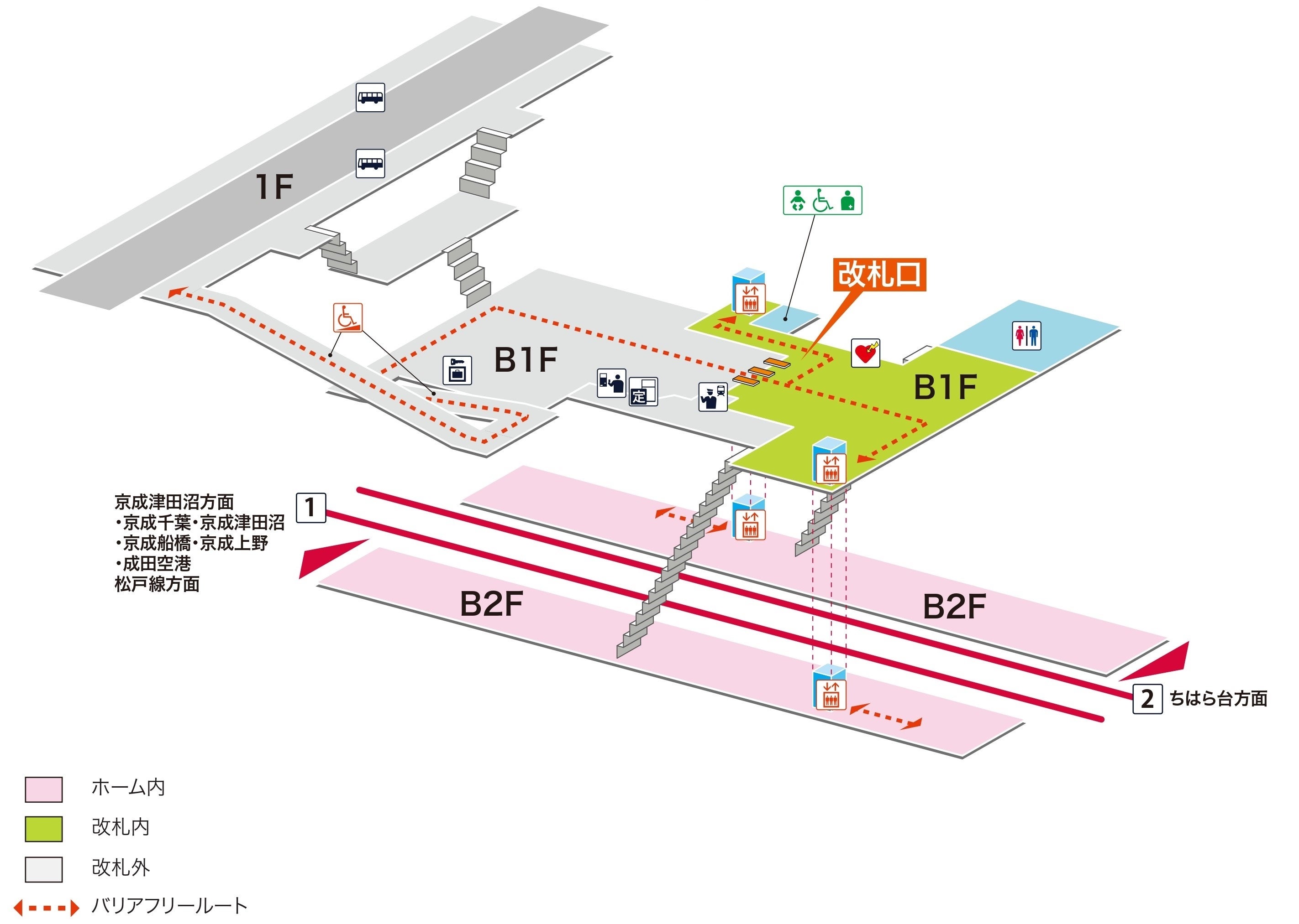 改札内には、オストメイト対応の水栓装置やおむつ交換シートなどを備えたバリアフリートイレを新設し、上下ホームにはエレベーターを新しく整備いたします。また、千葉市施工により、改札外の道路と駅をつなぐスロープを同日供用開始いたします。