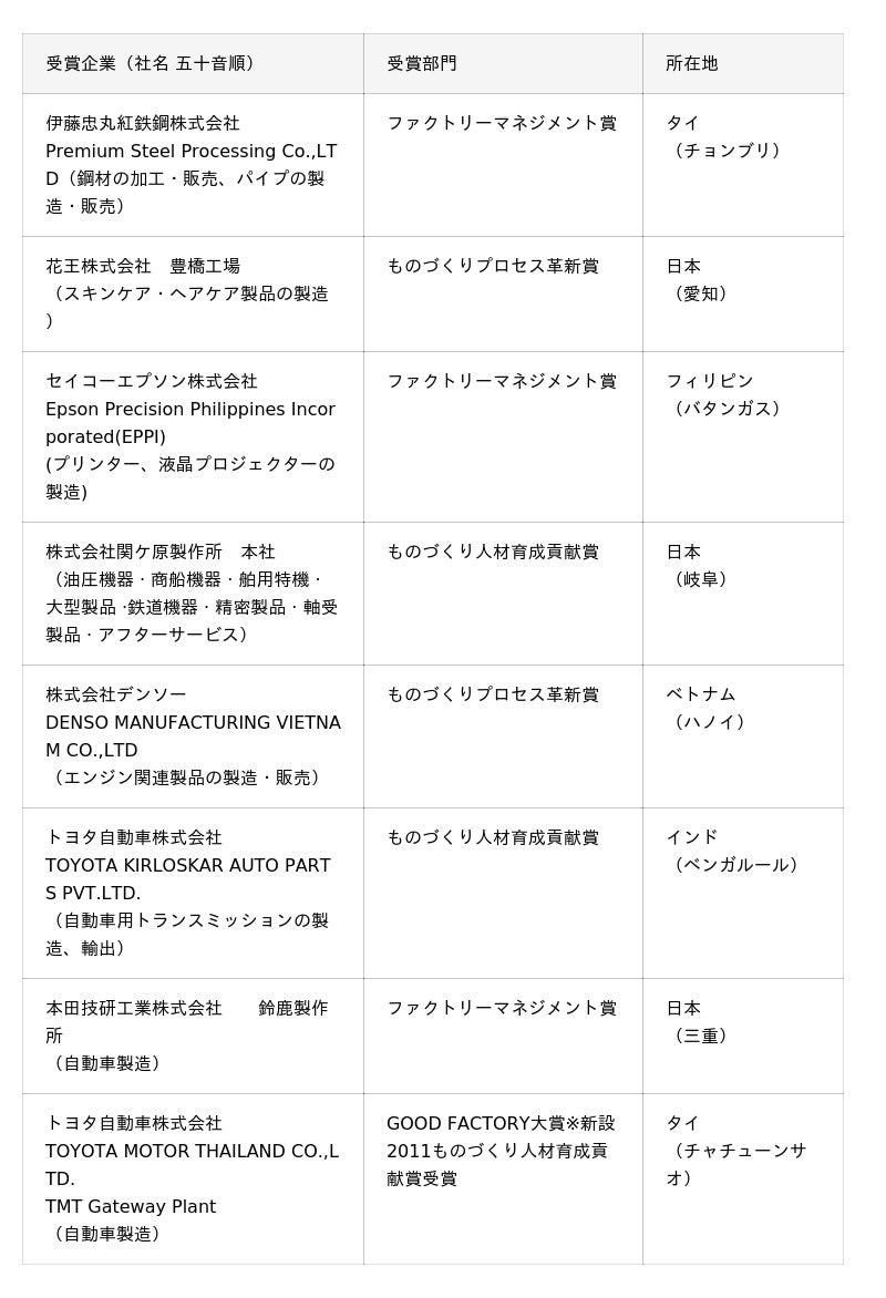 本賞は、日本および中国・アジア地域で、工場の生産性向上、品質向上をはじめさまざまな体質革新活動へ取り組まれている事例に着目し、そのプロセスや成功要因、現場の知恵、働く方々の意識改革、社会的貢献などの内容を幅広く取り上げ、その成果を日本製造業の範として顕彰するものです。