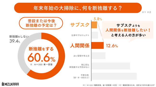認知科学に基づくコーチングを法人・個人に提供する株式会社ミズカラ(本社:東京都千代田区、代表取締役 山宮健太朗)は、2025年11月18日(火)に25歳~59歳の既婚有職男女500名を対象とした「年末年始に断捨離したいもの」調査を行いました。