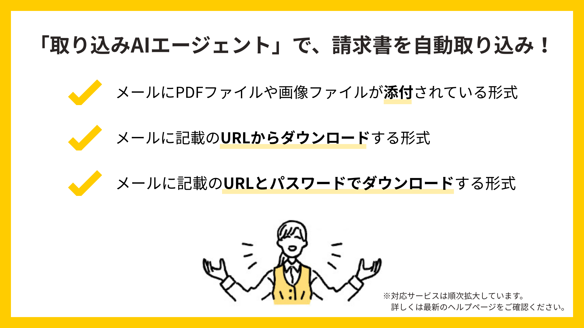 ~メール添付やURLにアクセスしてダウンロードするなど、多様な請求書をAIが自動で取り込み~